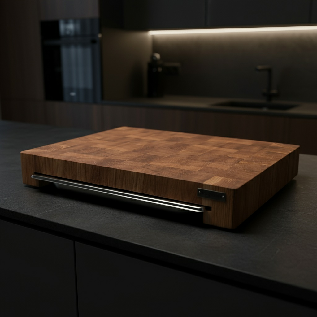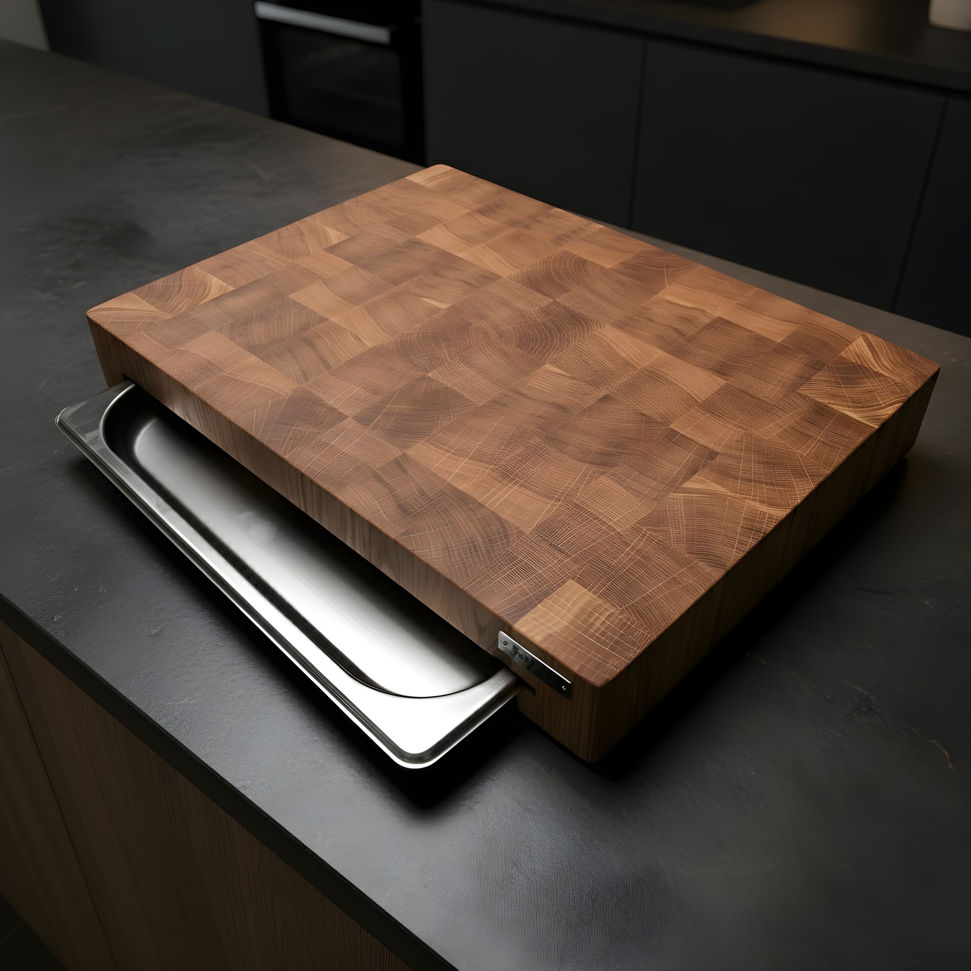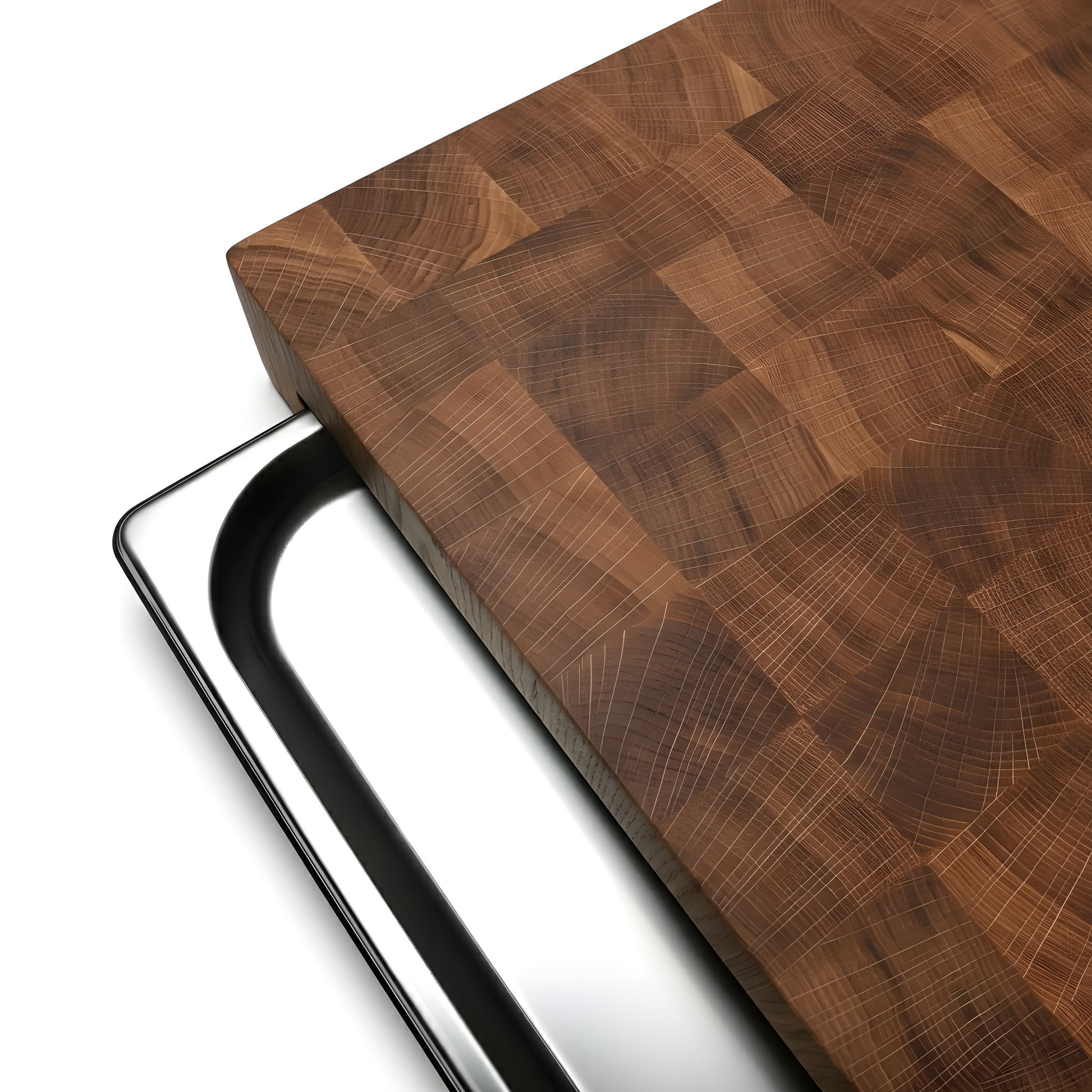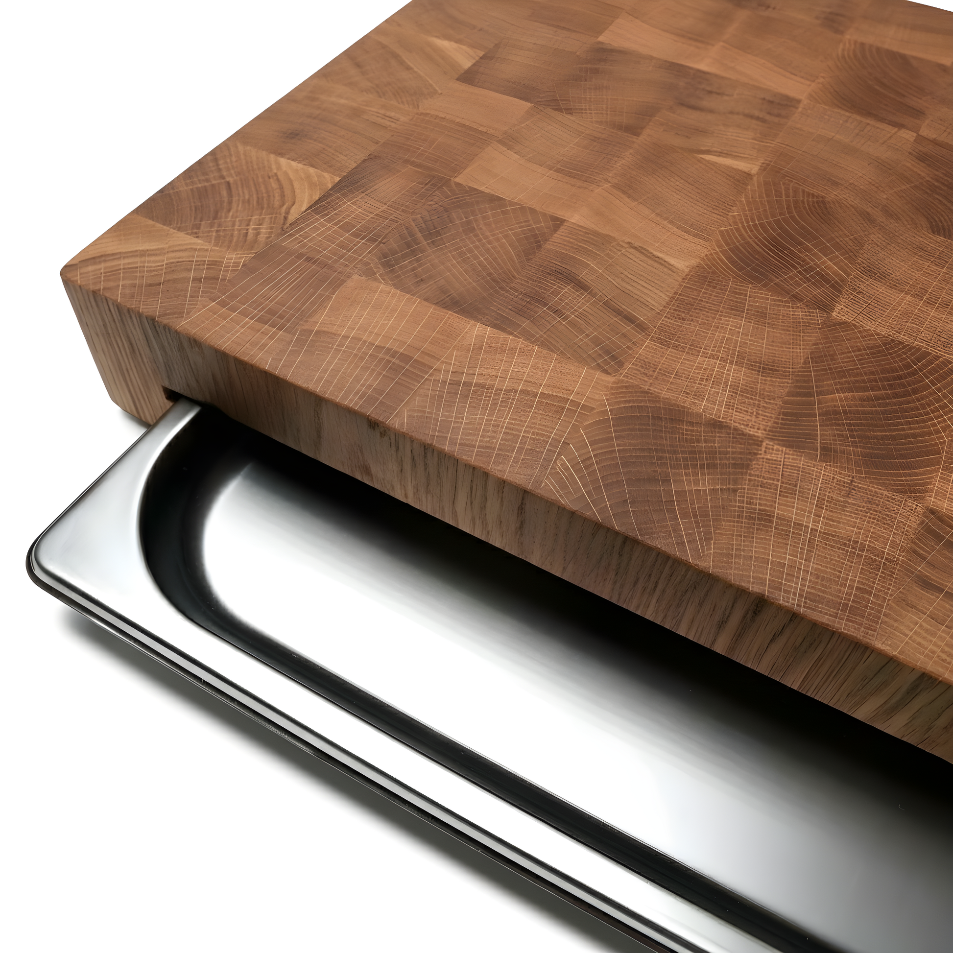Die Variante mit Edelstahl-Gastrobehälter macht die Zubereitung noch effizienter: schneiden, schieben, fertig – ideal für sauberes Arbeiten in der Küche. In der Variante ohne Behälter überzeugt das Brett durch schlichte Eleganz und kompromisslose Qualität.
